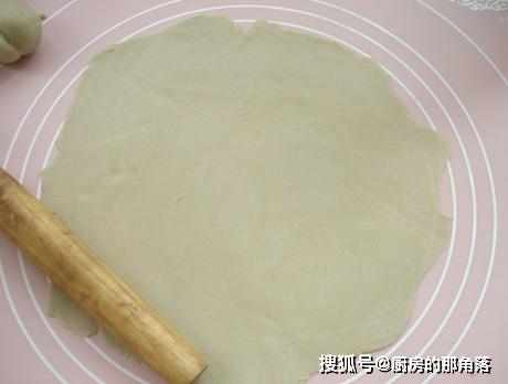 第三步,揉好的麵團,移至案板上,不用再揉,揪成一個個的小劑子,直接用擀麵杖,將其擀成2毫米厚的薄餅;