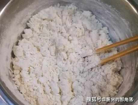 第二步,一邊倒入一邊攪拌,直至成為面絮,晾至不燙手時,揉成麵團;