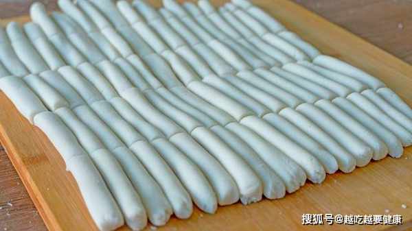 4、再來切成小段兒,撒點幹麵粉後抖散,避免全部粘連在一起,江米條的生胚就做好了。