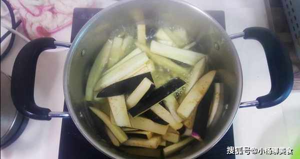 第四步,起鍋燒水,先將鍋中倒入適量的水,最好是要一次性估量一下多少水,然後開大火將水燒開,放入一點食鹽和白醋,然後再將我們切好的茄子條放入水中,焯水大約三分鐘,直到茄子變軟,然後我們再將再用漏勺將茄子條撈出,瀝幹水分。當然大家也需要注意一下,在焯水的過程中,大家要不停地用漏勺來翻動一下茄子條,這樣可以讓茄子條受熱比較均勻一些。