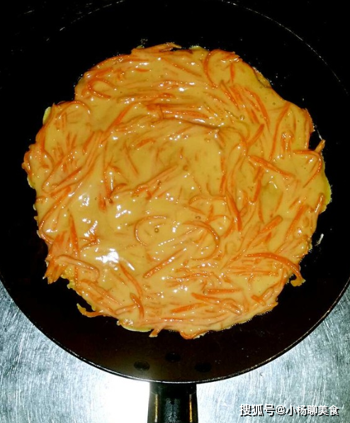 第二步,將胡蘿蔔絲麵糊準備好了之後,我們就可以直接放在平底鍋裡面開始煎了。