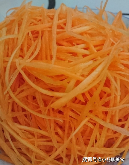 第一步,首先我們需要將兩個將新鮮的胡蘿蔔清洗乾淨,然後用刀切成細絲,切好之後的胡蘿蔔絲。