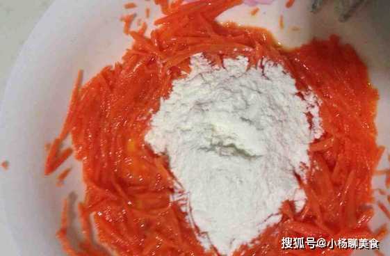 大家就不用再放入水中清洗了,因為這時候的胡蘿蔔,它上面富含大量的維他命以及營養物質,我們這時候只需要將胡蘿蔔絲放入一個乾淨的盆中,往盆中打入兩個新鮮的雞蛋,加入一勺的面粉,然後再往裡面加入一勺食鹽以及少許的胡椒粉,用筷子充分的將這些食材都攪拌的均勻,將胡蘿蔔絲條成面糊糊,最後再往上面撒上一把蔥花,攪拌均勻即可。