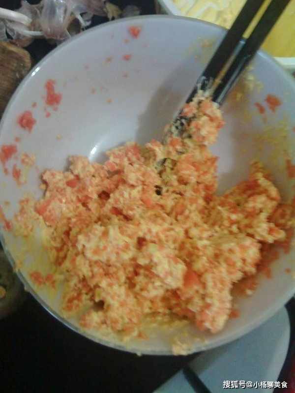 第五步,起鍋燒油,油溫上來之後,將我們剛剛切碎的胡蘿蔔丁兒以及洋葱塊一起倒入鍋中,開始翻炒均勻,然後炒出洋葱的香味兒,將洋葱塊和胡蘿蔔塊一起放在剛剛我們裝土豆泥的大碗中,同時,我們也記得將清洗乾淨的蝦仁一起放在土豆泥的碗中,然後直接用手去攪拌均勻。