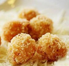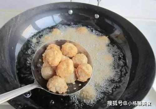 第八步,起鍋燒油,油溫上來之後,直接將大火轉成小火,然後將我們裹好的小丸子一起放在油鍋裡面開始炸,直到將小丸子炸的金黃酥脆的時候撈起來備用,撈起來瀝控幹裡面的油。