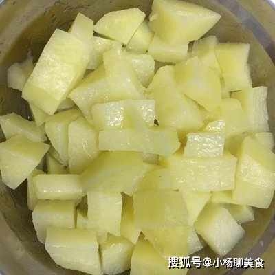 第二步,先將我們準備好的洋芋去皮兒清洗乾淨,然後將洋芋切成小塊兒,切好之後放在清水中繼續清洗乾淨,因為洋芋裡面它含有大量的澱粉,我們需要把這一層澱粉給清洗掉,然後放在一邊瀝幹水分備用。