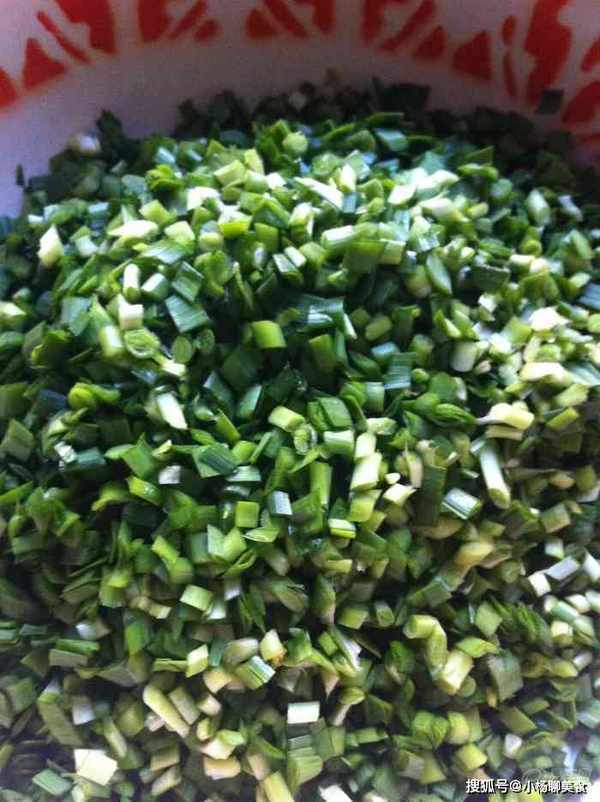 第四步,等到我們將韭菜浸泡好了之後,將韭菜撈出來瀝幹水分,切成韭菜碎,裝入一個乾淨的大盆中。
