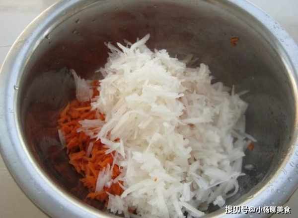 1、我們把白蘿蔔和胡蘿蔔分別洗乾淨擦成絲,盛到一個盆子裏,然後加上適量的食鹽,攪勻之後醃制半個小時,將蘿蔔中的水分醃制出來,也能很好的去除蘿蔔的苦澀和辛辣味。