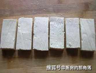 :第一步,將準備好的新鮮豆腐切成大約1釐米的長方形薄塊,放在盤中備用。