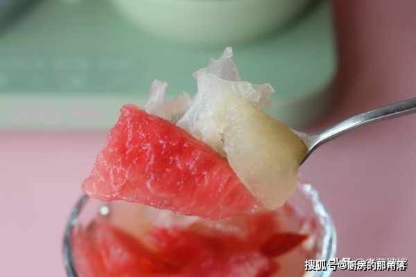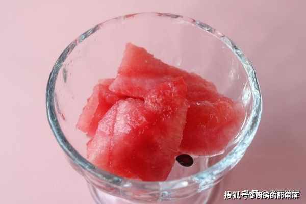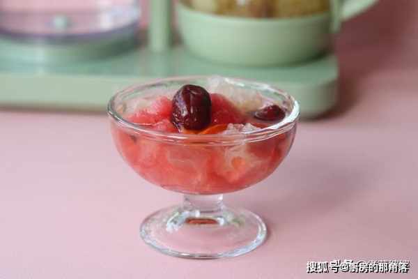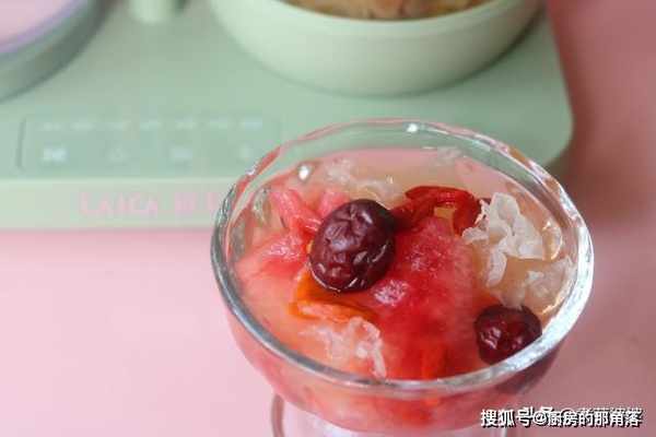 步驟6,烹煮好以後,晾溫一下。接著拿出西瓜,切成小塊,放在玻璃杯底,然後倒入溫熱的銀耳梨子甜湯,就可以開喝了。