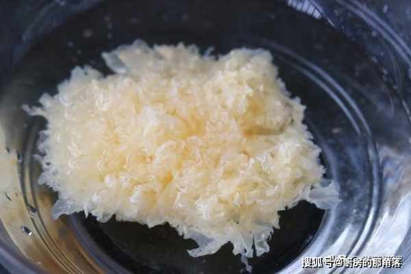 步驟1,拿出幹銀耳,用流水沖洗1遍,然後放入大碗中,注入清水浸泡半小時。浸泡至完全泡發後,用剪刀剪去根部,撕成小塊,淘洗乾淨,瀝幹。