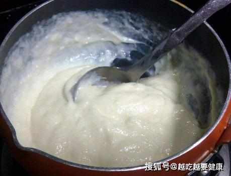 第二步,然後充分地將其攪拌均勻,攪拌好牛奶糊之後,即可將煮鍋置於火上,開始加熱,注意要一邊加熱,一邊不停地攪拌,直到將牛奶糊炒熟,並且變成濃稠之後;