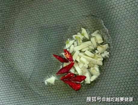 第三步,準備好所有的食材,接下來開始炒菜,炒鍋中添上少許的食用油,放入幹紅辣椒,小火將其爆炒出香味,放入葱薑蒜末,繼續煸炒出其中那個的香味;