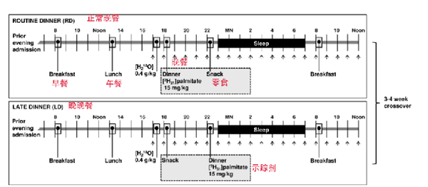 研究團隊通過邀請了20多名健康志願者(10男10女),並且在晚上20點(LD)給他們安排了一樣熱量的晚餐,而食物中有脂肪示踪劑,從而能够檢測到他們所吃的食物在人體內代謝具體情况。