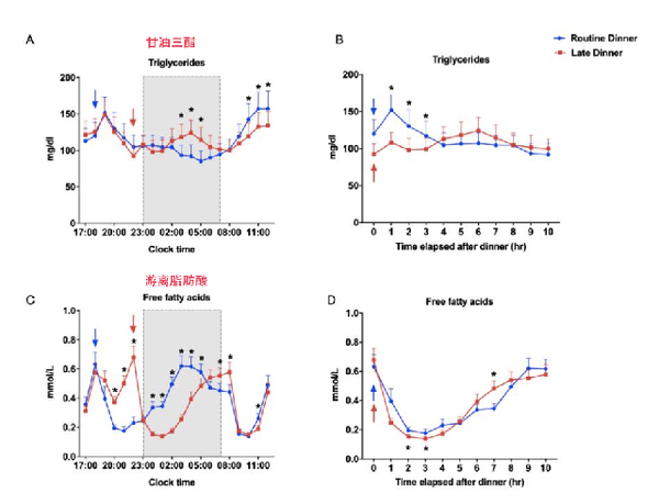 同時,20點進食,不僅血糖升高,甘油三酯峰值延遲、FFA動員降低和膳食脂肪酸氧化降低,同時還降低了睡眠代謝能力。