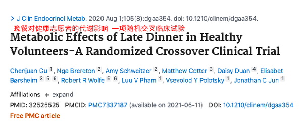【1】Gu C,Brereton N,Schweitzer A,et al. Metabolic Effects of Late Dinner in Healthy Volunteers-A Randomized Crossover Clinical Trial.[J] J Clin Endocrinol Metab. 2020;105(8):dgaa354.