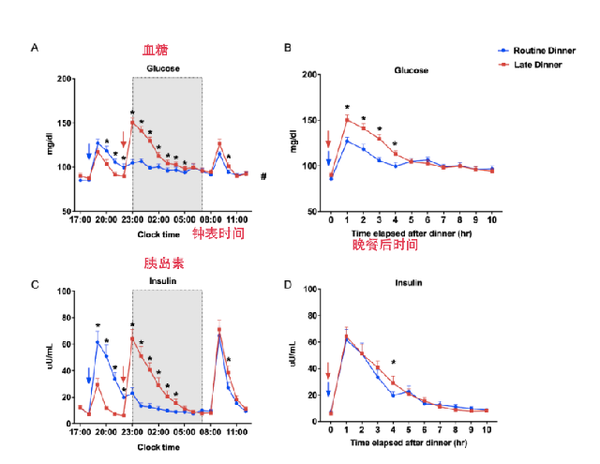 而通過資料對比,對比18點進食,20點進食的血糖和胰島素也都升高,而且20點的血糖水准明顯高於18點進食,在晚飯後4小時內保持高濃度。