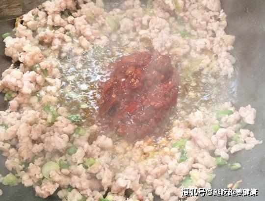 第四步,待煸炒出香味,肉沫變色的時候,倒上適量的白酒和魚露,繼續煸炒,接著放入豆瓣醬,炒出紅油;