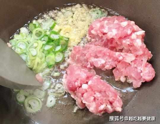 第三步,炒鍋預熱,倒上適量的油,凉油放入葱薑和肉沫,開始煸炒;