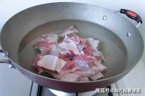 3、首先鍋燒清水,將牛腩肉冷水下鍋,焯水三分鐘,過程中撇去多餘的浮沫,這一步的目的是,將牛腩肉由內而外地去除掉,多餘的雜質和血水,所以這一步,大家一定不要忽略,接著三分鐘後,將其撈出控水備用。