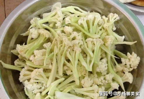 第二步,我們先將準備好的花菜切成一小塊兒一小塊兒的,或者直接用手掰成一小段一小段兒的,然後放在清水中清洗乾淨,清洗過程中,放一點鹽,可以有效去除裡面的雜質,也可以給花菜新增一點底味,然後撈出來瀝幹水分備用。