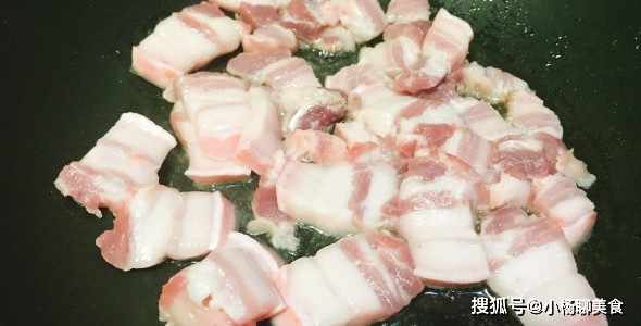 第五步,另鍋燒油,油溫下來之後,將這熱油倒出重新加入一點冷油,然後再將我們切好的五花肉片放入鍋中一起炒,炒至五花肉的油脂大量出來之後,再將我們剛剛準備好的薑蒜末以及小米辣椒放入鍋中一起炒香。