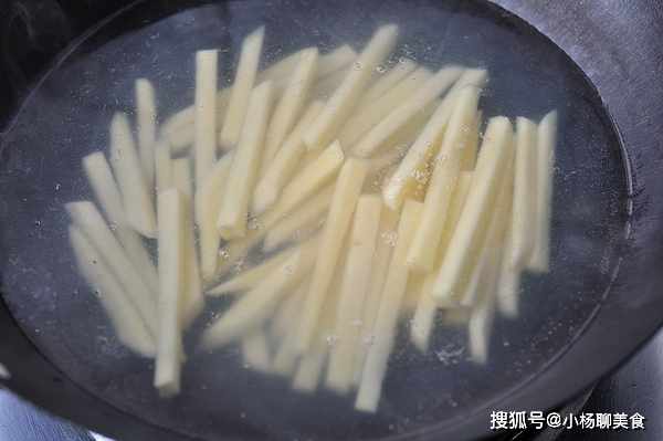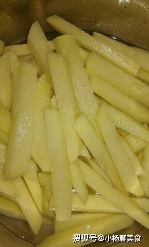 將洋芋切成洋芋條之後,我們需要放在清水中,用手輕輕搓洗幾遍,將上面的澱粉給清洗掉,以免洋芋氧化變成黑色。