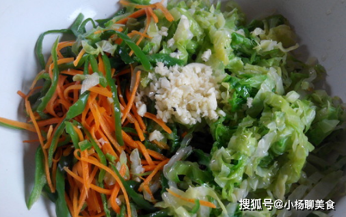 第三點,我們將包菜和胡蘿蔔絲控幹水分之後直接放入一個乾淨的盆裡面,然後往裡面加入切好的大蒜末以及花椒、辣椒面兒,然後再起鍋燒一點點熱油,將熱油直接淋在菠菜和胡蘿蔔絲上面攪拌,用筷子攪拌均勻。