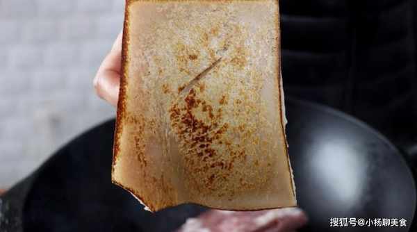 我們先將鍋清洗乾淨,然後直接燒幹,燒幹之後將猪皮直接底部朝下貼著鍋底開始烙燙,這樣的話就可以直接將猪皮給軟化,燒沒掉。多數人可能除了用鑷子以外,他還是喜歡放在火上面直接燒,這樣的話會將猪皮上面的毛都燒焦,而且殘留一種很不好聞的味道。