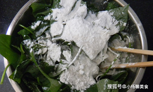第三點,將紅薯葉子放在一個乾淨的大盆裡面,往裡面撒入適量的麵粉,只需要將紅薯葉子上面保留一層麵粉就可以了,然後再往上面加入一點兒油,攪拌均勻。