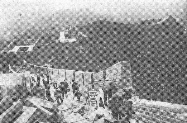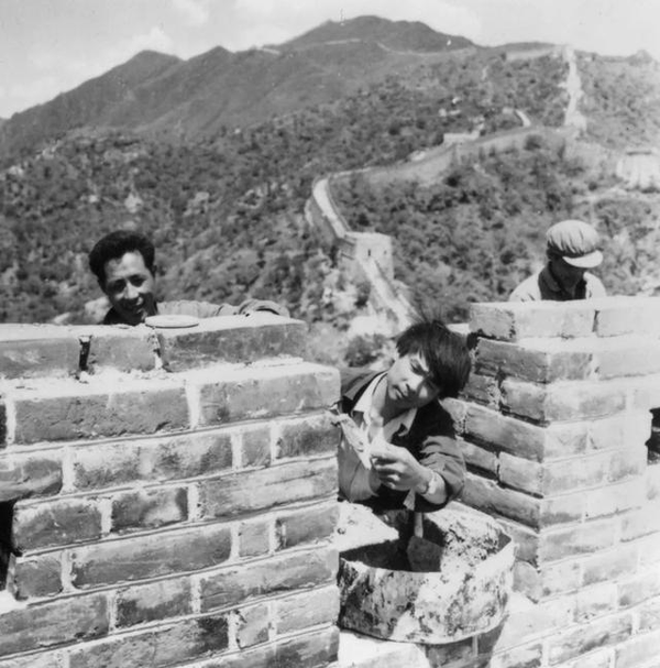 △1984年8月,"愛我中華,修我長城"社會贊助活動北京八達嶺長城北七、北八兩城臺的修復工程正在施工。圖為工人們正在修整第七城臺的一段城牆。