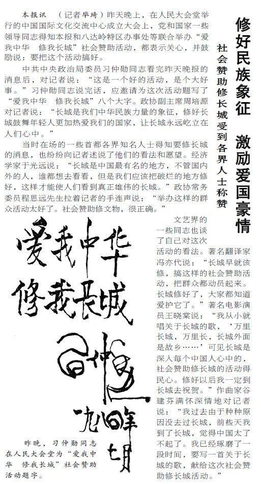 長城學會副會長董耀會:7月6日,習仲勳就為這個活動題了詞。9月1日的時候,鄧小平又為"愛我中華,修我長城"這個活動題詞。整個"愛我中華,修我長城"這個活動在北京贊助委員會接受的捐款就有2800萬人民幣。
