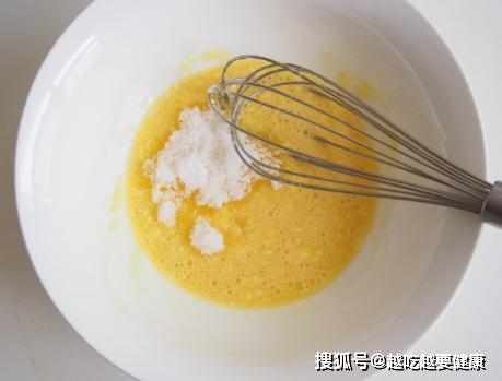 第三步,然後在盛有蛋黃的容器中,加入差不多50克的白砂糖,用打蛋器將其攪打均勻,然後將奶粉、低筋面粉和玉米澱粉的混合物用篩網過濾在蛋黃中,同時再加入事先融化好的黃油;