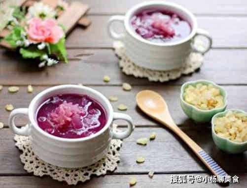 紫薯銀耳羹是一道營養極其豐富的甜品,它的味道香甜,顏色也好看,看著就讓人食欲大增,它還能起到抗衰老的作用,這道湯品可是很多愛美女士們的首選,不過像這種營養極佳的湯品,老人小孩喝了能增強體質,早上喝豆漿牛奶,不如喝"它",女人喝了滋陰抗衰老,老人孩子喝了增強體質!