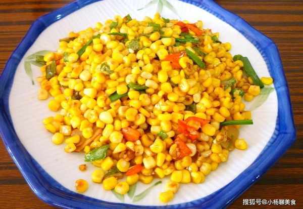 5、熱油鍋,放入胡蘿蔔丁、玉米粒翻炒幾下。