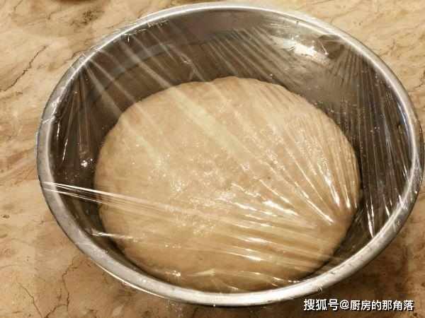 2.然後再蓋上一層保鮮膜,防止麵團水分的流失。放置一旁醒發兩小時備用。(很多人做油條的時候,只放了酵母。其實這樣做是不對的,我們還得放入小蘇打才可以。)