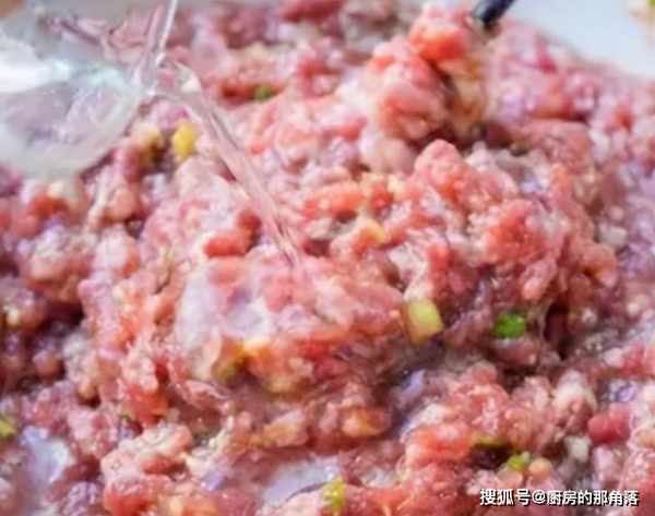 所謂的打水,就是在肉餡中加入適量的水,再充分攪打,讓肉餡完全吸收水分,這樣能給肉餡起到補水的作用,讓肉餡的水分更加充足,水分充足了,肉餡的口感就更鮮嫩。而所打入的水量不要太多,一般500克肉餡打入150克清水即可;在打入的時候要分次打入,每打入一次就要沿著同一個方向攪拌均勻,直至吸收後再打下一次。在打水的時候要注意,打入的水可以是葱薑花椒水、可以是高湯,也可以是清水,它們都能起到很好的作用,不過前兩個水打出來的肉餡口感更好。