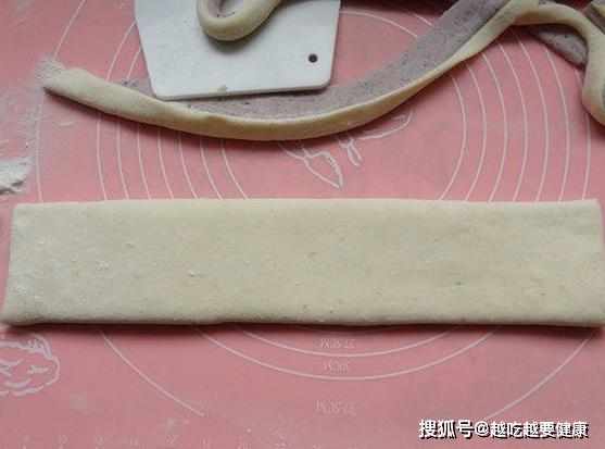 第五步,分別取一塊小米麵團和黑米麵團,擀成長條形,把白色麵團覆蓋在黑米麵團上,切去不規則的部分;