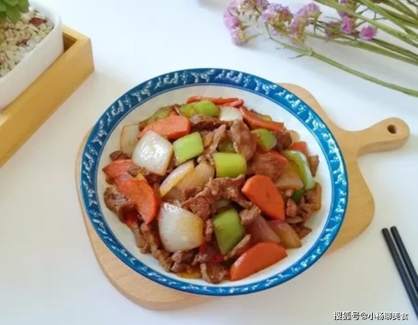 食材:牛肉,洋葱,青椒,胡蘿蔔,生薑1小塊,料酒1勺