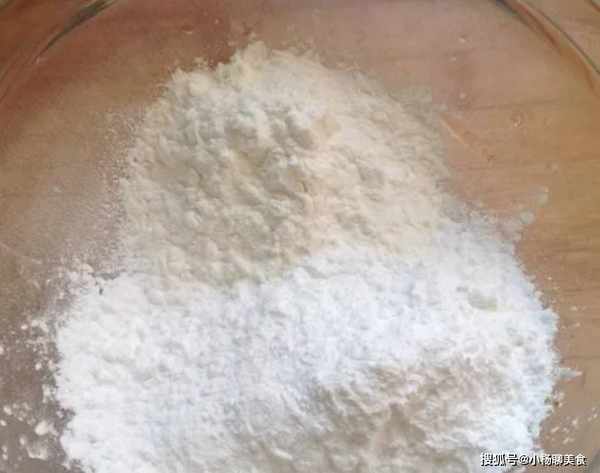 我們把剛剛準備好的成粉放在。大一點的盆中,然後再倒入三分之一的。澱粉在裡面。準備一碗開水。多次少量的加入在成分裏。攪拌均勻之後。揉成麵團兒,然後蓋上!保鮮膜餳發二十分鐘的時間!