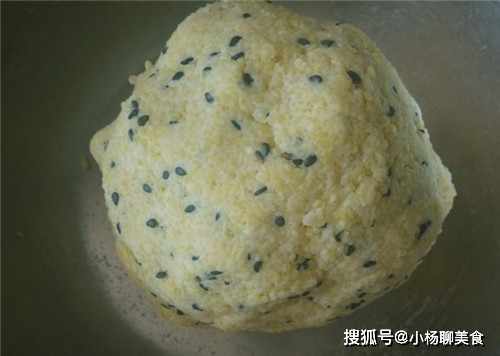步驟2:等到小米蒸好後拿出來,然後在小米中加上一點芝麻,並且在撒上一些鹽,最後在小米中加上100g的玉米澱粉,然後將它們快速的拌勻。並且在拌勻之後將它們小米和澱粉一起揉成幹濕合適的團。
