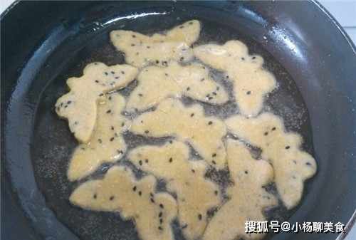 步驟3:接著將麵團拿出,並且用擀麵杖擀成薄薄的餅,接著將餅切成斜塊,或者用模具壓成形狀出來都行,等到全部切好之後,就可以用電餅鐺將這些都煎烤熟。如果沒有的,可以放在油鍋中炸到金黃色,然後就可以出鍋了。