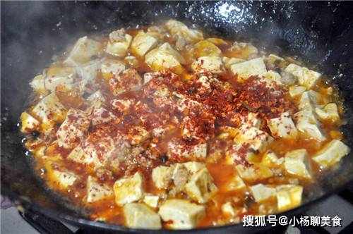 步驟3:在鍋中的倒入適量的油,燒熱後將豆腐下鍋,利用油溫將豆腐煎成金黃色,然後快速的撈出。接著再次起鍋,倒入肉翻炒,肉炒到變色後就加上一點豆瓣醬翻炒,直到變色之後就倒入開水,並且加上一點生抽,然後加上豆腐,同時蓋上蓋子用小火燉上個15分鐘。時間一到就撒辣椒粉,以及蔥花,然後裝盤。
