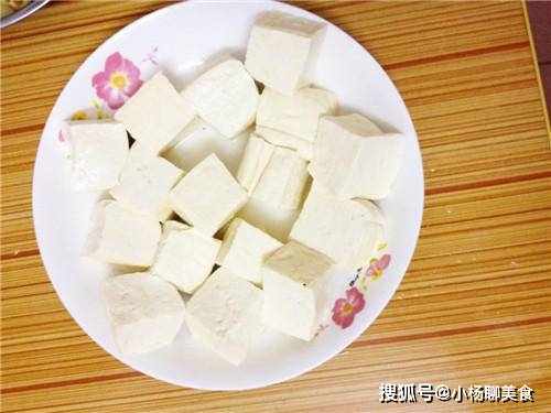 步驟1:將豆腐從水中撈出,清洗一下,然後切成小塊,並且在鍋中燒水,加上鹽煮開之後就將豆腐放進去煮,將豆腐的豆腥味去掉後就可以撈出了。接著將豆腐瀝幹水分後放在一旁的碗中備用。