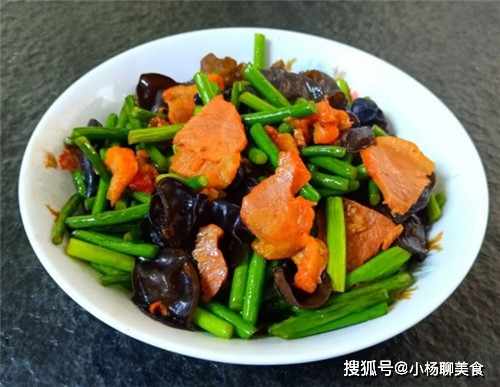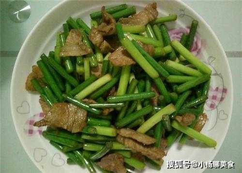 步驟三:在鍋經過清水的洗滌,並且燒幹發熱後倒入肉,如果是五花肉就可以少放一點油,將肉快速的炒一下後撈出。接著在鍋中倒油炒蒜苔,將蒜苔快速的翻炒一下,在快要炒熟時將肉倒入,並且在快速的翻炒一會,有辣椒放辣椒炒一下,並且還可以加上木耳炒一下,沒有的就可以直接出鍋了。