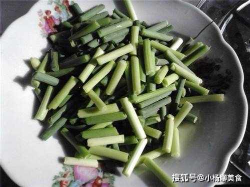 步驟一:先將蒜苔的尾巴切掉,並且將蒜苔碼齊後,將它頭部也一刀切掉一點點。然後將蒜苔放入清水中清洗乾淨,在洗乾淨之後將蒜苔切成段,並且裝入碗中,同時在碗中加上一點點鹽,將蒜苔拌一下後,放上5分鐘。