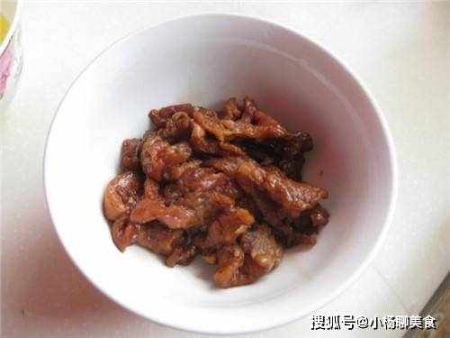 步驟二:將肉用清水洗乾淨,然後將肉切成片,並且將肉裝入一旁的碗中,同時一手拿料酒一手拿醬油,將它們依次倒入一點放入碗中,然後在撒上一些澱粉。接著就快速的將肉拌勻,並且也醃制上一下小會,5-10分鐘就能入味好了。
