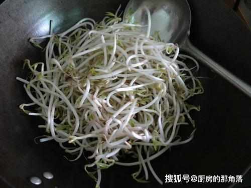 3.然後再將準備好的綠豆芽放入裡面大火快炒兩分鐘,炒至綠豆芽斷生,加入精鹽三克調味,陳醋半勺大火快炒一分鐘就可以出鍋裝盤了。