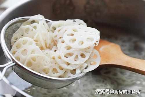 3.炒鍋加入適量的清水大火燒開,水開後加入白醋一勺,然後再放入處理好的藕片。大火汆燙兩分鐘。兩分鐘後將其快速地撈出,然後過凉水沖涼,備用。