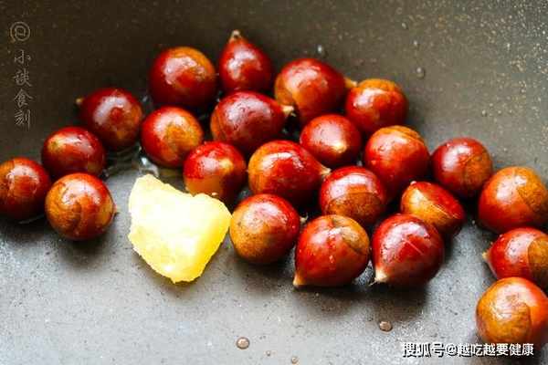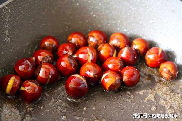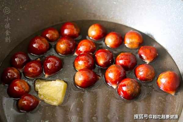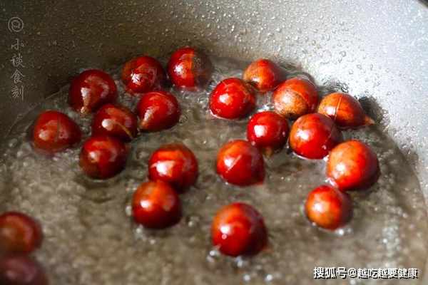 栗子處理好以後,很多人煮的時候不入味,其實煮栗子同樣也有技巧。栗子開好口以後,放入到水中,加入老冰糖1塊,再放入食用油,水不要加的太多,在栗子的1/2分處就可以了,煮至汁快幹的時候,快速攪拌,這樣煮出來的栗子,去殼方便而且還特別的入味